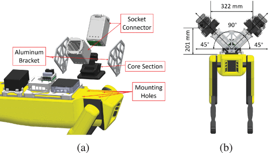 安装座和插座相对于矢状面和背侧平面成45度角,并且彼此之间成90度角。插座的位置也使得每个臂的工作空间中心彼此相距322毫米。每个3D打印插座都使用旋转锁定机构在插入后将臂保持在适当位置,每个插座底部的电连接器允许传输电力和数据。系统的工作空间能够涵盖四足机器人的整个背侧,系统的跨度略大于人类平均臂展。