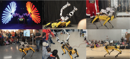 Orthrus 系统用于多种娱乐和外展应用。这些应用程序包括带有工具的多转弯模式(左上)模仿动物般的动作(中上)圣诞钟声响起(右上)基于路点的挥手(左下)糖果讲义(下中)和小学外展(下中)