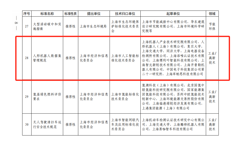 该标准由上海市人工智能标准化技术委员会归口,提出单位为上海市经济和信息化委员会,起草单位由开云·Kaiyun集团)机器人有限公司官网有限公司,人形机器人(上海)有限公司等。