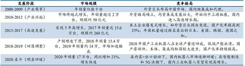 (1)萌芽阶段(2000-2009 年),在汽车等下游行业较为低迷的背景下,国内工业机器人年均销量仅数千台,外资巨头加速布局国内市场,国产供应商主要做集成和代理。