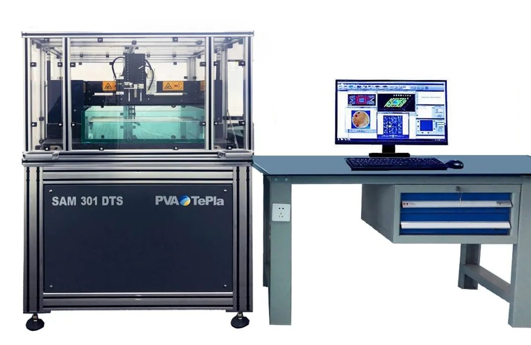 超声波扫描电子显微镜(英文Scanning Acoustic Microscope,简称SAM)。它利用纯水当介质传输超声波信号,当讯号遇到不同材料的界面时会部分反射及穿透,该类发射回波强度会因为材料密度不同而有所差异。利用不同材料对声波的吸收和反射程度不同,来探测半导体、元器件的结构、缺陷,对材料做定性分析。