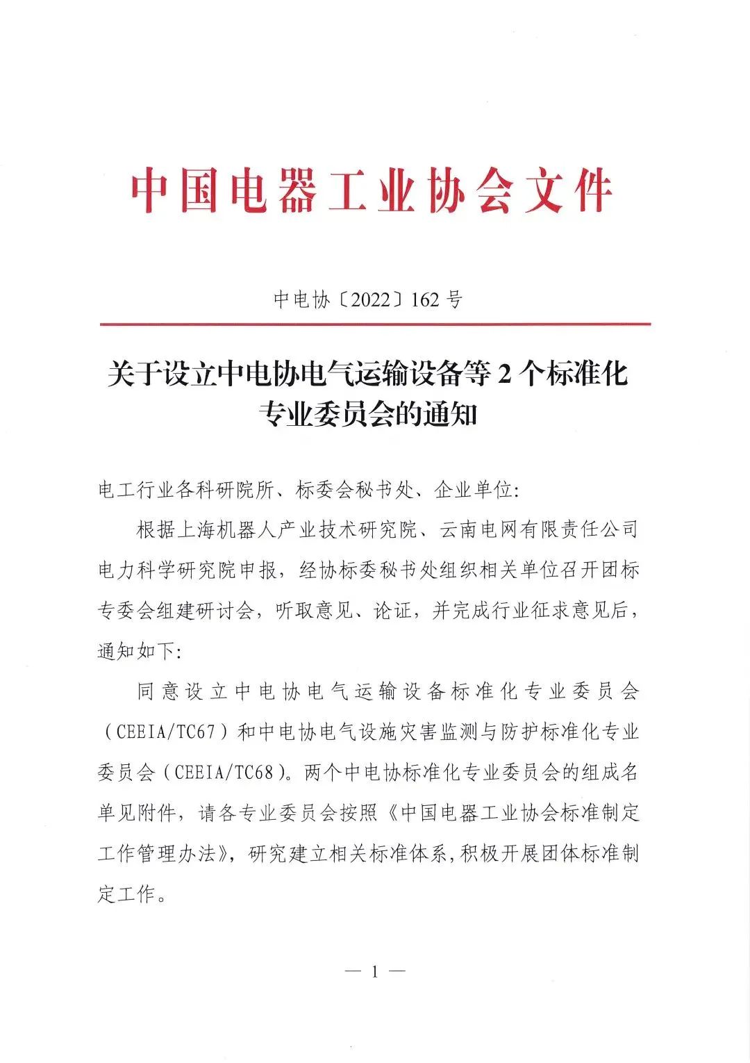 2022年10月20日,中电协[2022]162号文件下达了《关于设立中电协电气运输设备等2个标准化专业委员会的通知》,同意设立中电协电气运输设备标准化专业委员会(CEEIA/ TC67),秘书处挂靠单位为开云·Kaiyun集团)机器人有限公司官网。