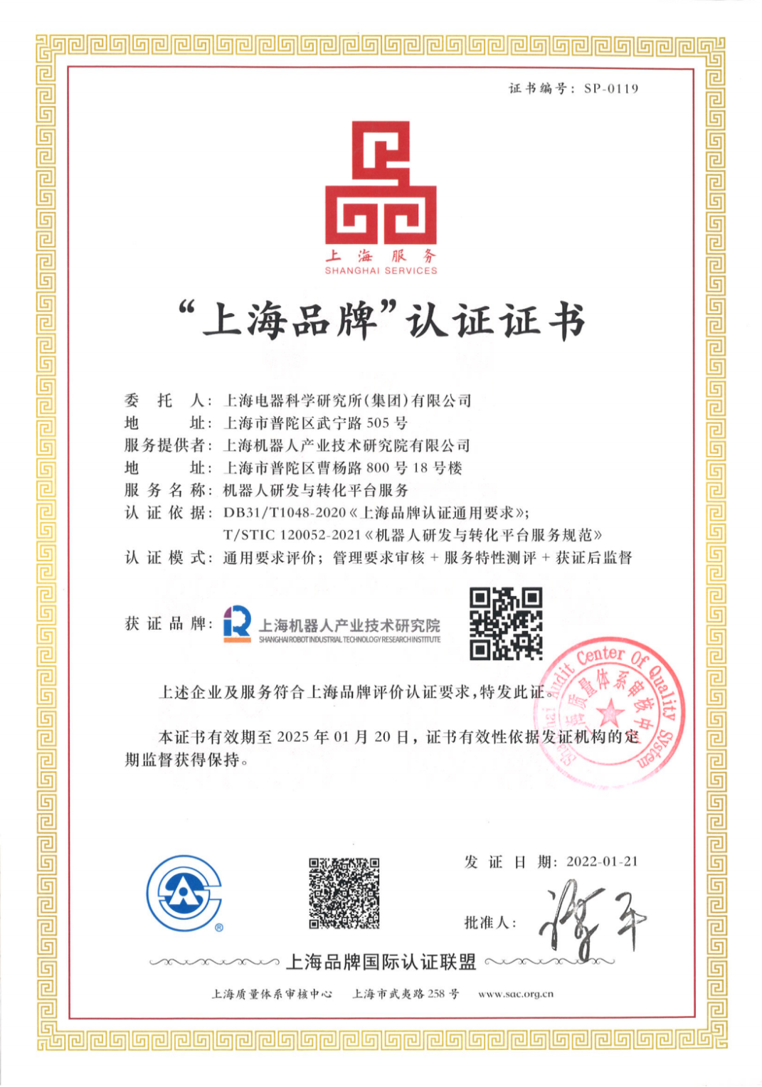 经过近6个月的评价过程,从专业初评、专业终评到综合评定等环节的严格评审,最终通过“上海标准”评价。经上海标准评价委员会评定,在服务范围、服务提供、研发管理、转化管理、信息化应用、绩效评价方法、关键评价指标等方面达到国内国际领先水平,具有一定的先进性,实施成效良好,为机器人智能化研发与转化服务提供了重要的标准支撑。