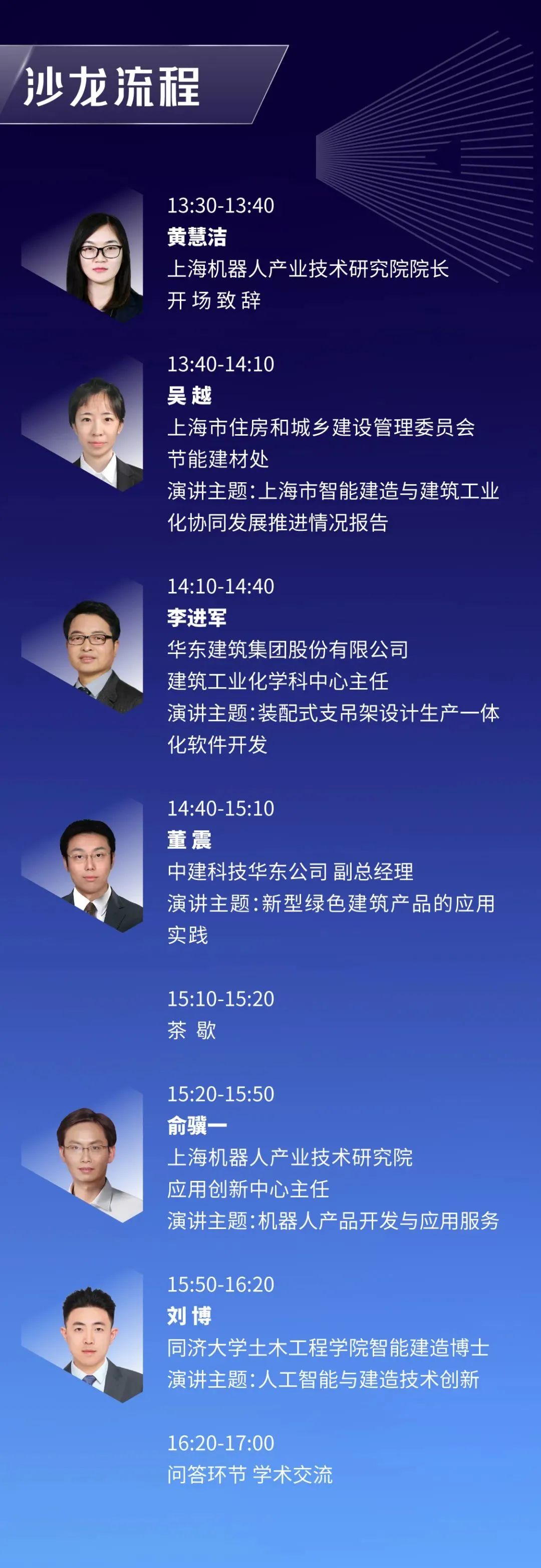 本次沙龙特邀上海市住房和城乡建设管理委员会节能建材处、开云·Kaiyun集团)机器人有限公司官网、中建科技、华建集团、 同济大学土木工程学院五位大咖与大家深度分享智能建造技术与产业协同,产品与项目实践,创新与发展融合。